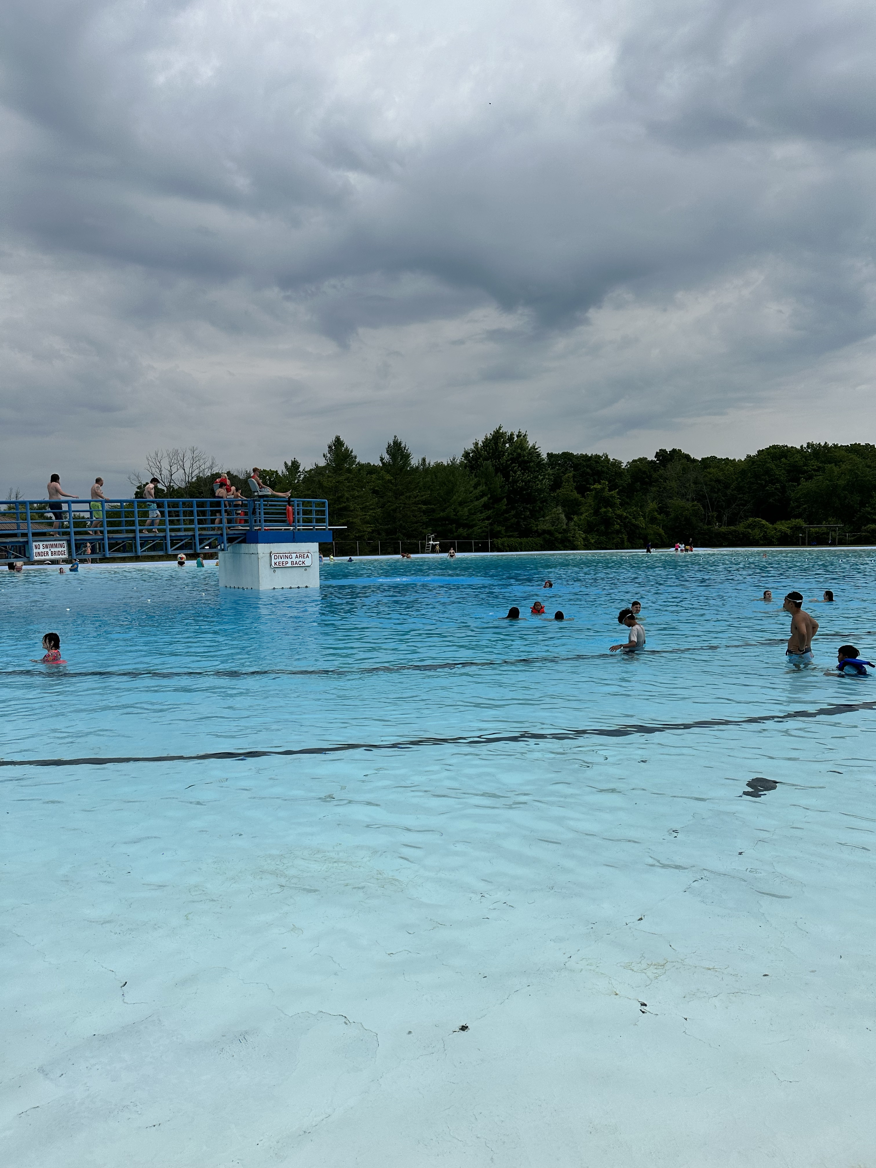 There is a huge diving board that reaches the middle of the pool.
